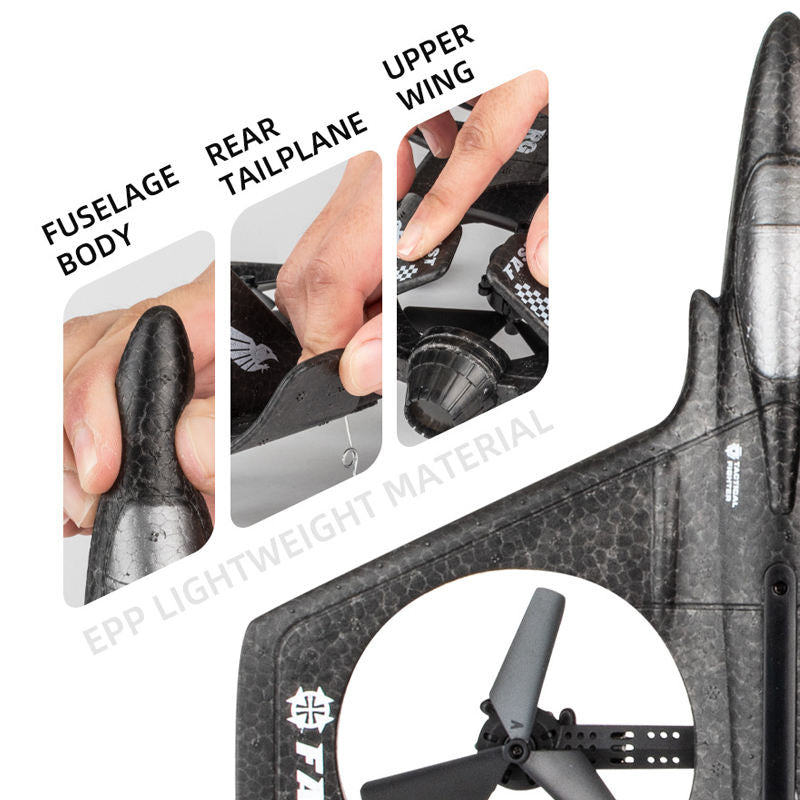 Key Materials/Features: 2.4GHz RC, 360° stunt flips, headless mode, auto return, dual fan propellers, fixed wing style